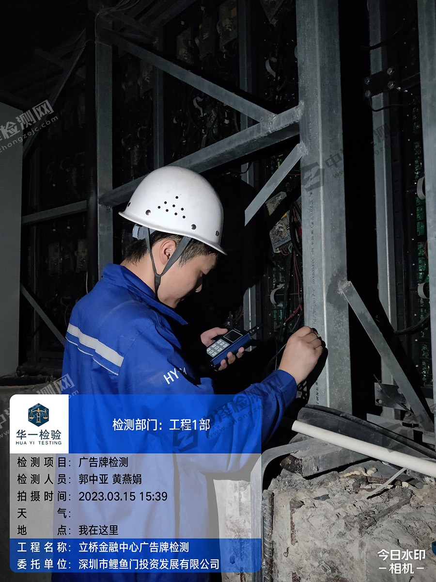 该金融中心钢结构广告牌需要进行系统的钢结构广告牌检测,以杜绝钢结构广告牌存在安全隐患,本次钢结构广告牌检测项目用时1个工作日,由2位钢结构广告牌检测工程师进行检测。